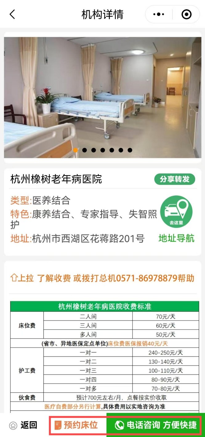 进入杭州橡树老年病医院机构详情,点击底部床位预约或电话咨询即可。