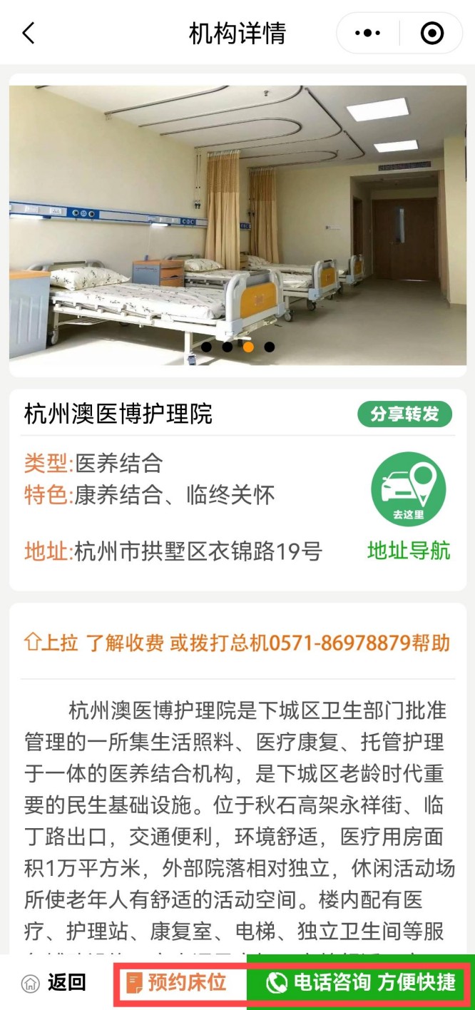 进入杭州澳医博护理院机构详情,点击底部床位预约或电话咨询即可。