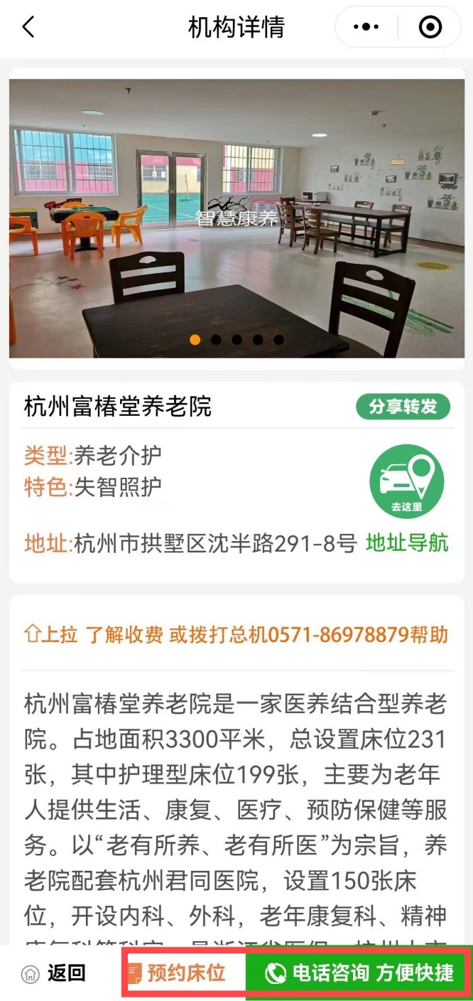 进入杭州富椿堂养老院机构详情,点击底部床位预约或电话咨询即可。