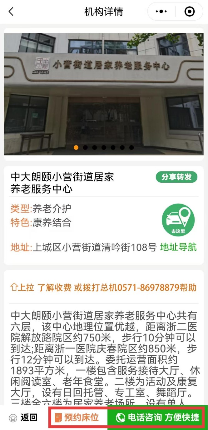 进入中大朗颐小营街道居家养老服务中心机构详情,点击底部床位预约或电话咨询即可。