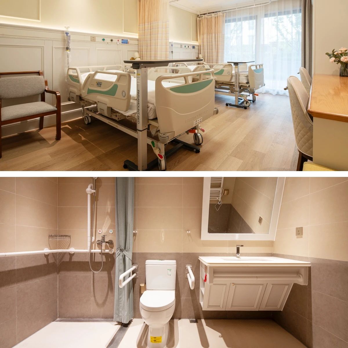 二楼以上,均是护理院的病房,有多种格局的房间供选择,比如:1楼有花园式庭院,2楼以上独立阳台,同时每个房间都拥有独立的卫生间,适老化设备齐全,并配置了中央空调,地暖,拉绳报警,床头医护对讲,国内专业的电动护理床,55寸电视机等。